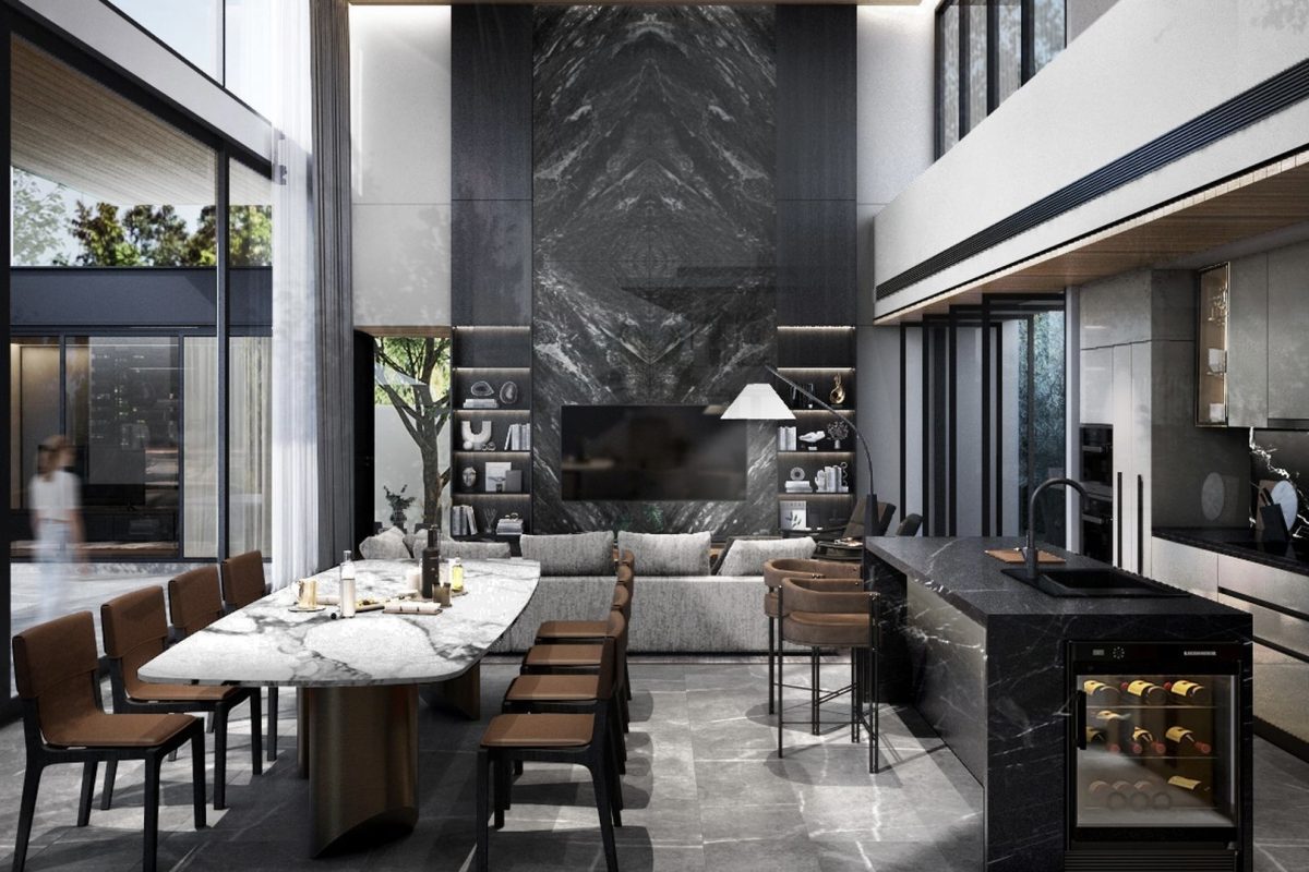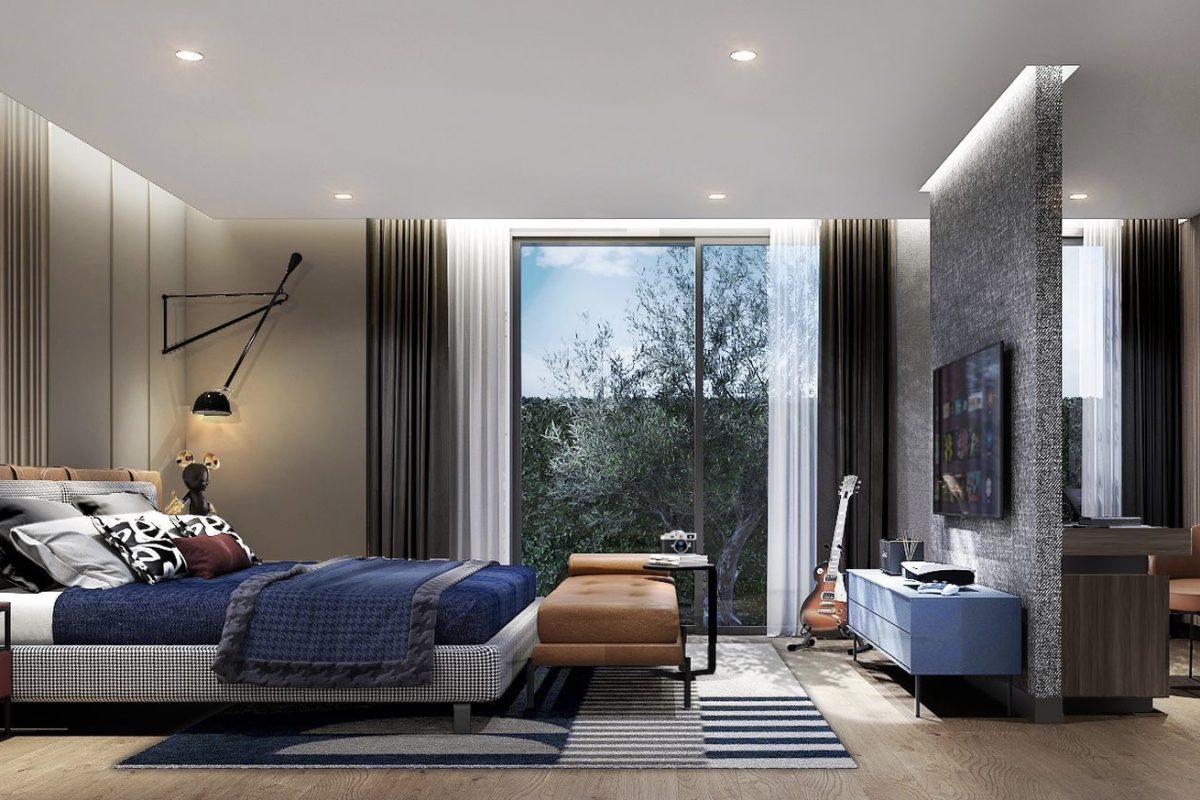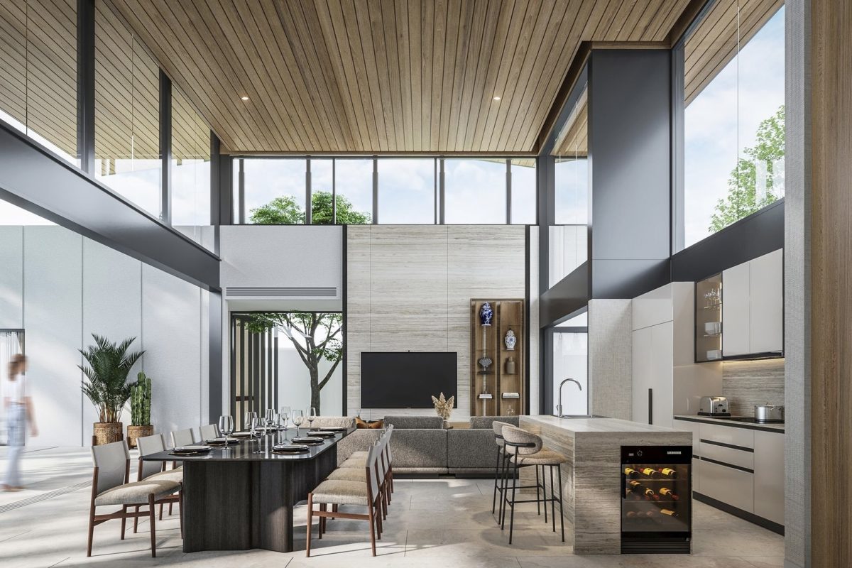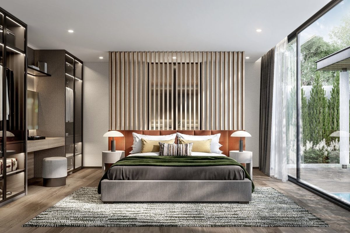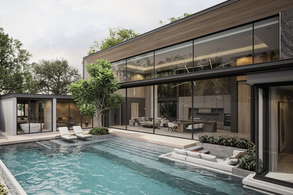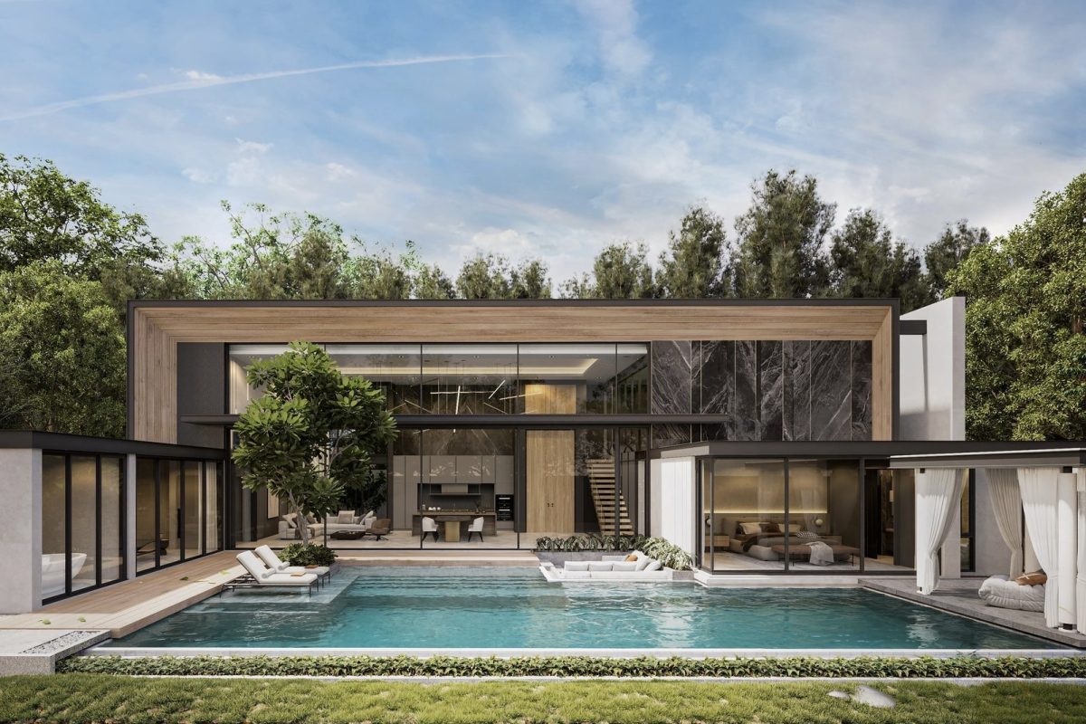 На вилле: каждая вилла оснащена частным бассейном с террасой, просторной гостиной с потолками высотой до 6 метров, кухней открытой планировки и спальнями с прямым выходом к бассейну. Проект предлагает два варианта интерьерного оформления — в светлой и тёмной цветовой гамме. Планировка включает 3 спальни и одну многофункциональную комнату, которую можно адаптировать под четвёртую спальню, детскую, кабинет, фитнес-зал или зону отдыха. В отделке использованы премиальные материалы: натуральный камень, высококачественная древесина, алюминиевые профили европейского стандарта и фурнитура высокого класса.