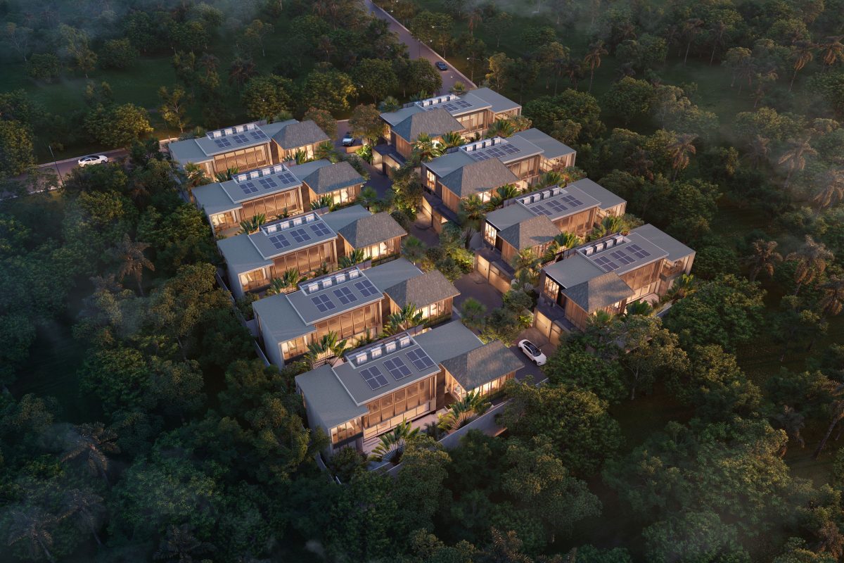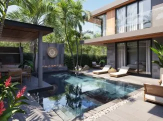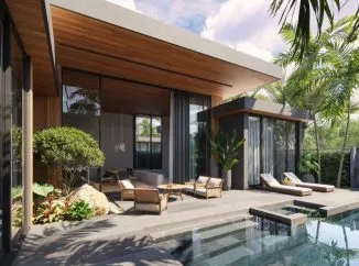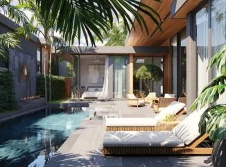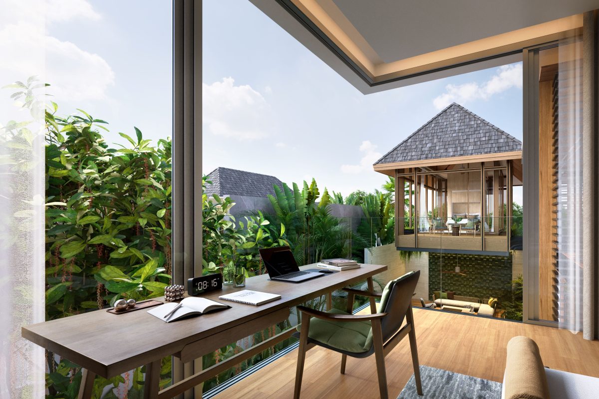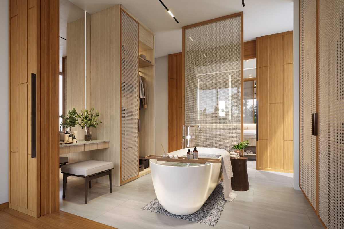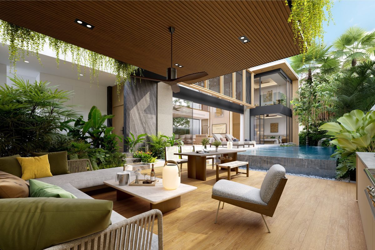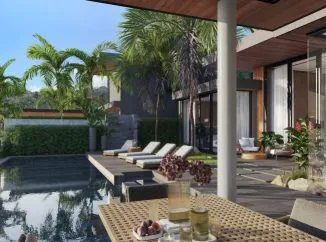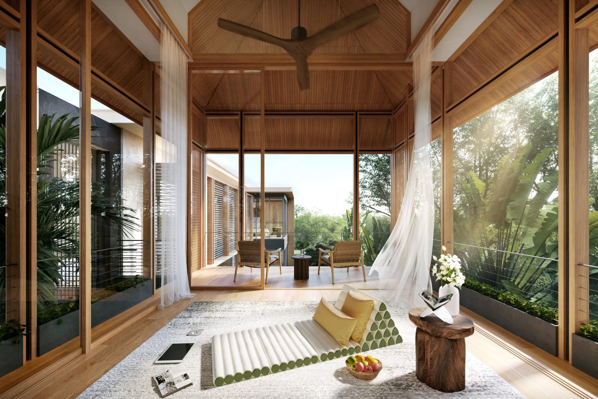 На вилле: каждая вилла спроектирована с акцентом на простор и естественное освещение. Высокие потолки и панорамное остекление создают ощущение воздуха и света, а из гостиной открывается прямой выход на террасу и к бассейну. В планировке предусмотрены 4 или 5 спален с ванными комнатами, гостиной, кухней, прачечной и парковкой на 2 автомобиля. В отделке используются натуральные материалы — дерево, ротанг, керамика и батик ручной работы.