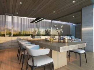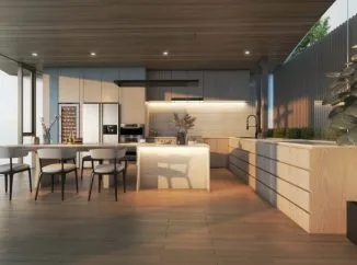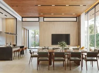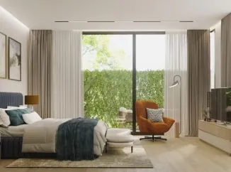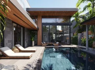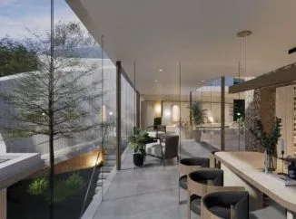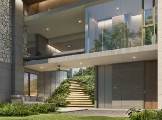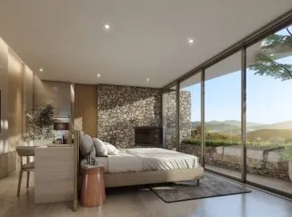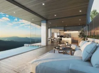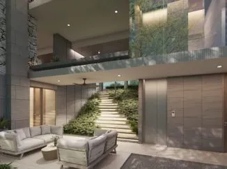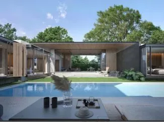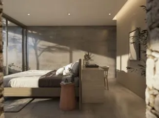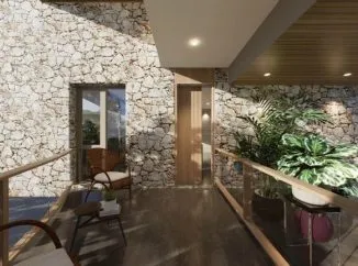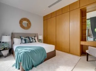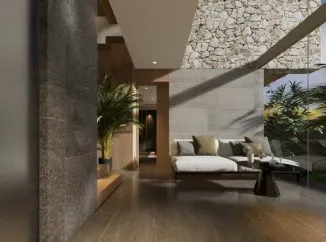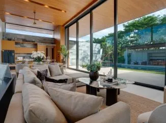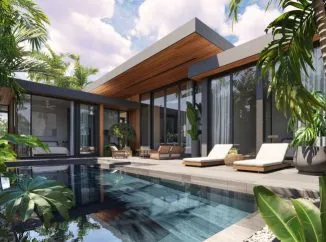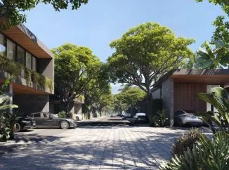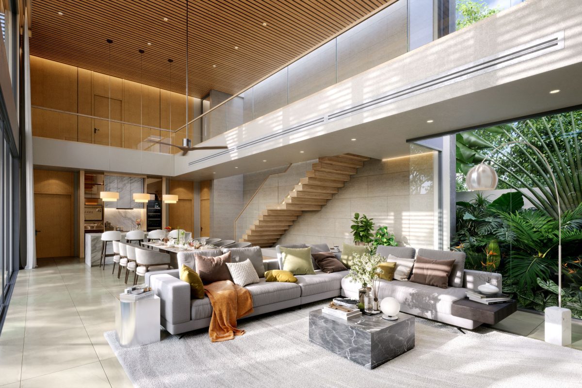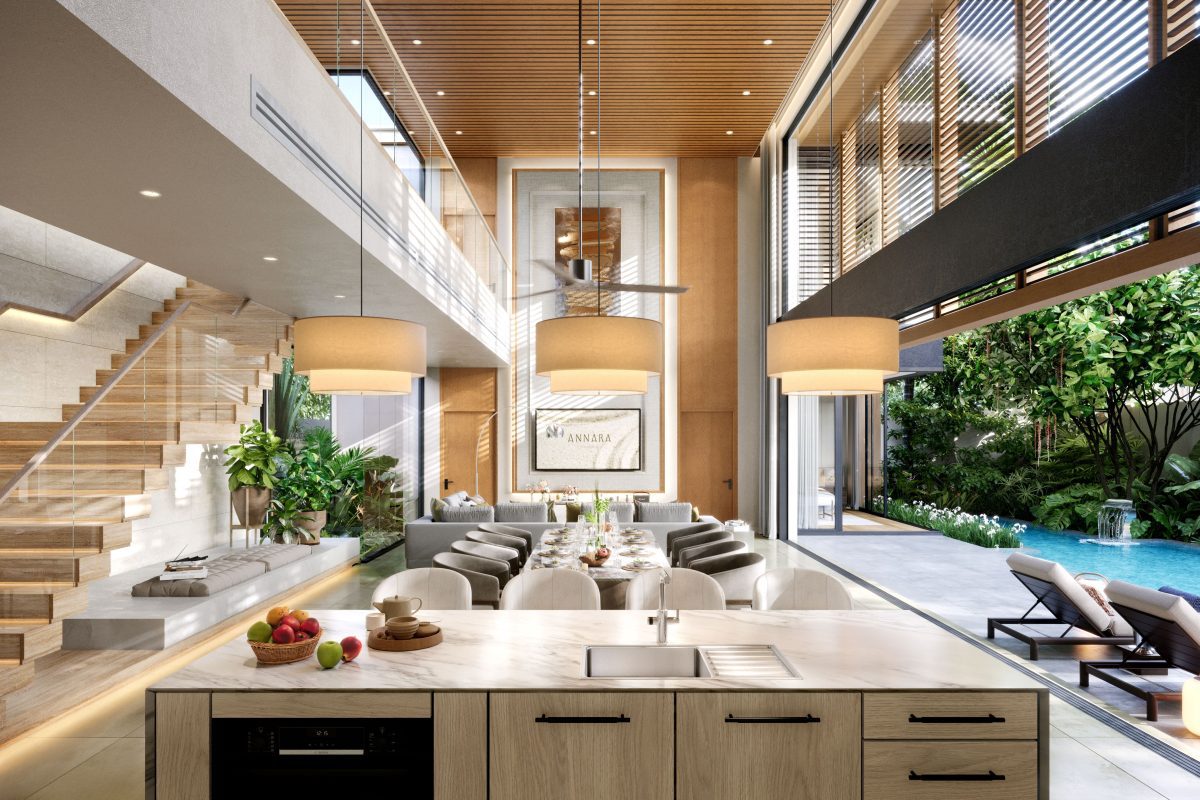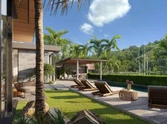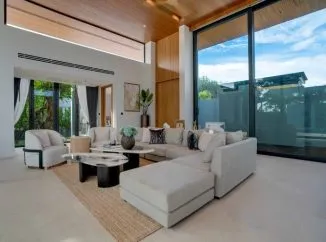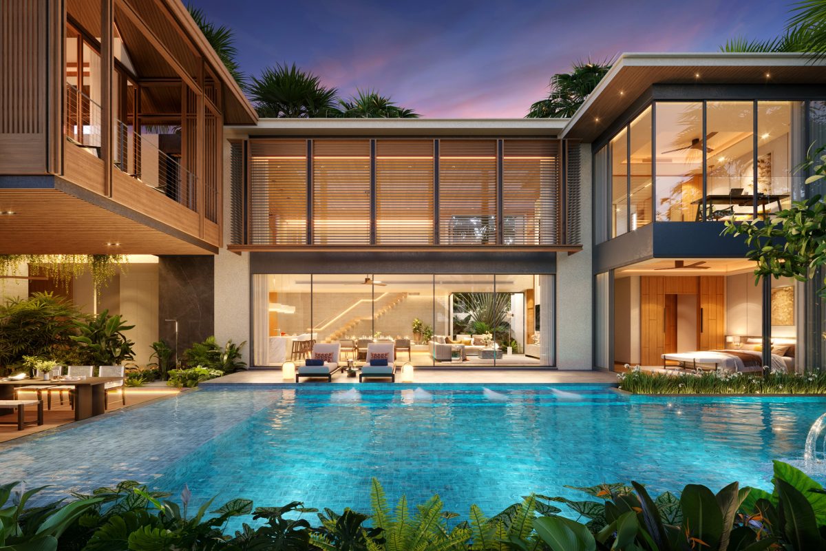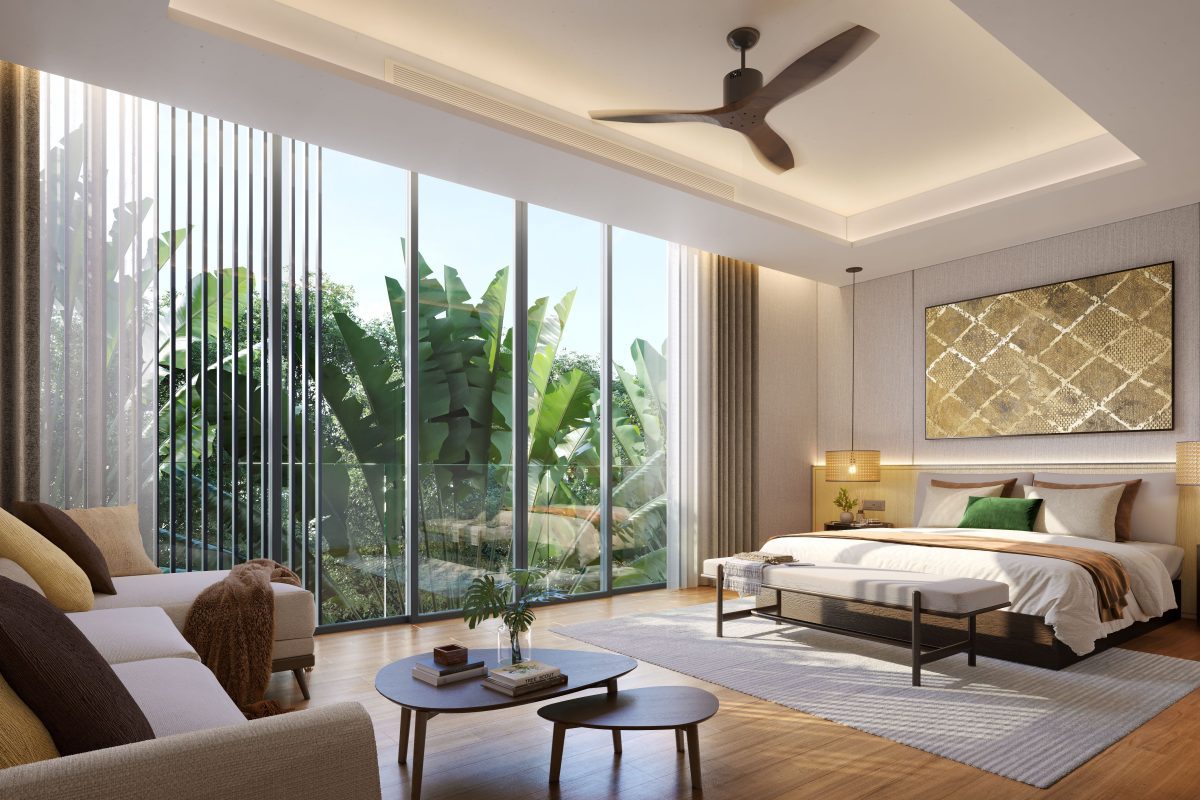 На вилле: каждая вилла спроектирована с акцентом на простор и естественное освещение. Высокие потолки и панорамное остекление создают ощущение воздуха и света, а из гостиной открывается прямой выход на террасу и к бассейну. В планировке предусмотрены 4 или 5 спален с ванными комнатами, гостиной, кухней, прачечной и парковкой на 2 автомобиля. В отделке используются натуральные материалы — дерево, ротанг, керамика и батик ручной работы.