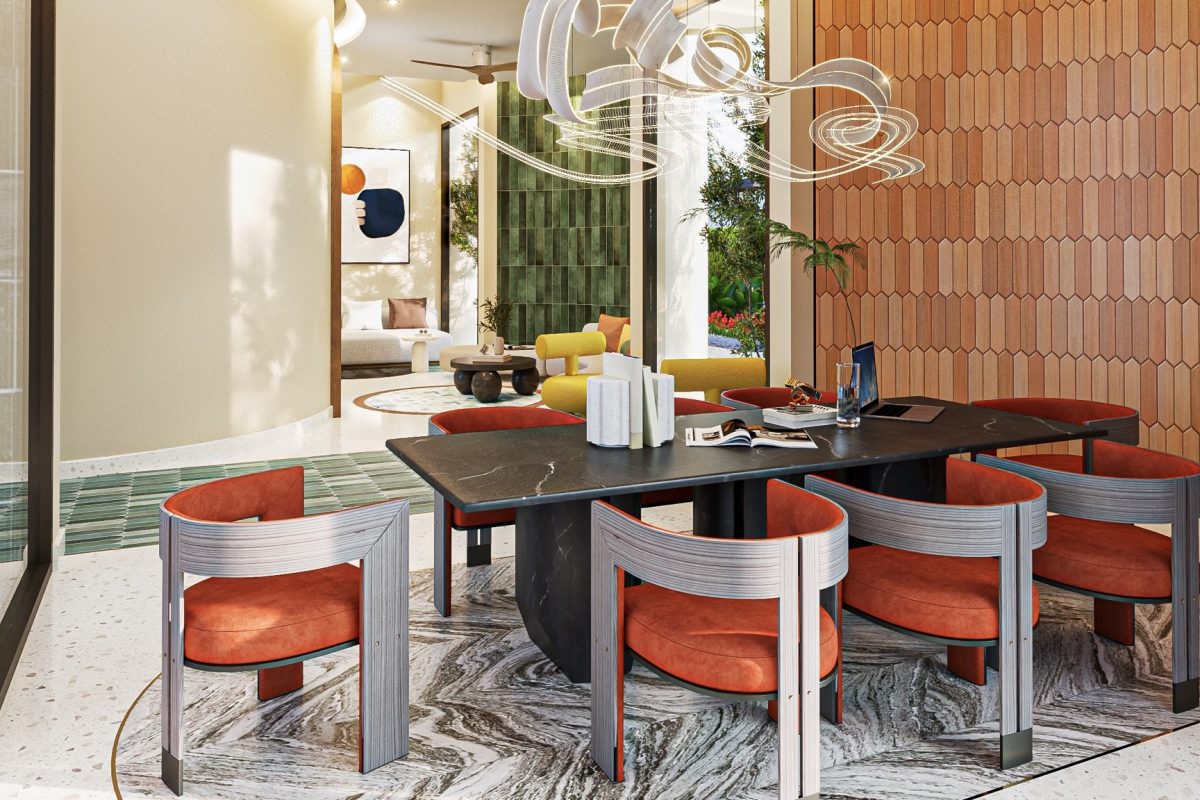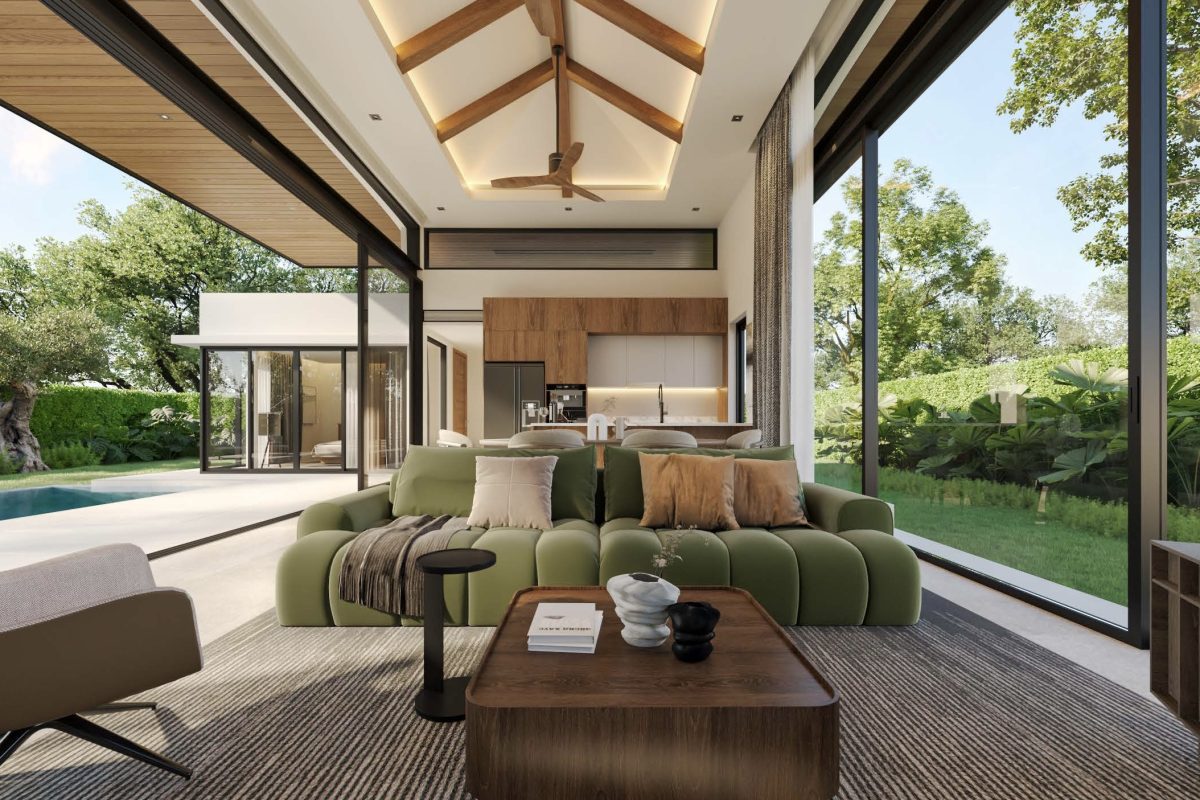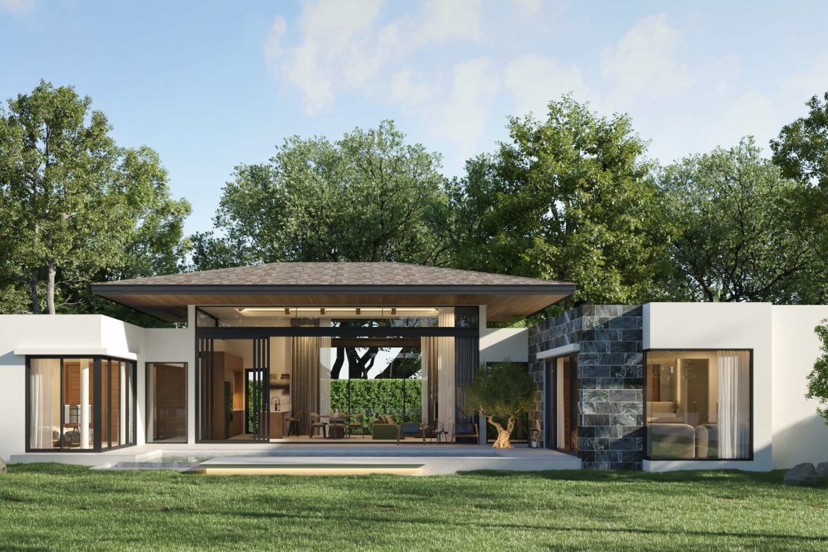 На вилле: все виллы имеют 3 спальни и 3 ванные комнаты, построены с акцентом на комфортный микроклимат: продуманная вентиляция, большие окна, лёгкие материалы и натуральная отделка. Пространства объединяют интерьер и сад, создавая эффект лёгкости и уединённости. Архитектура вдохновлена эстетикой 50-х годов: чистые линии, натуральные материалы, внимание к свету и пространству. Площадь застройки — от 280 кв.м, участки — от 360 кв.м. В каждой вилле — частный бассейн 9 х 3.5 м, терраса, крытая парковка, прачечная, встроенная кухня и система «умный дом».