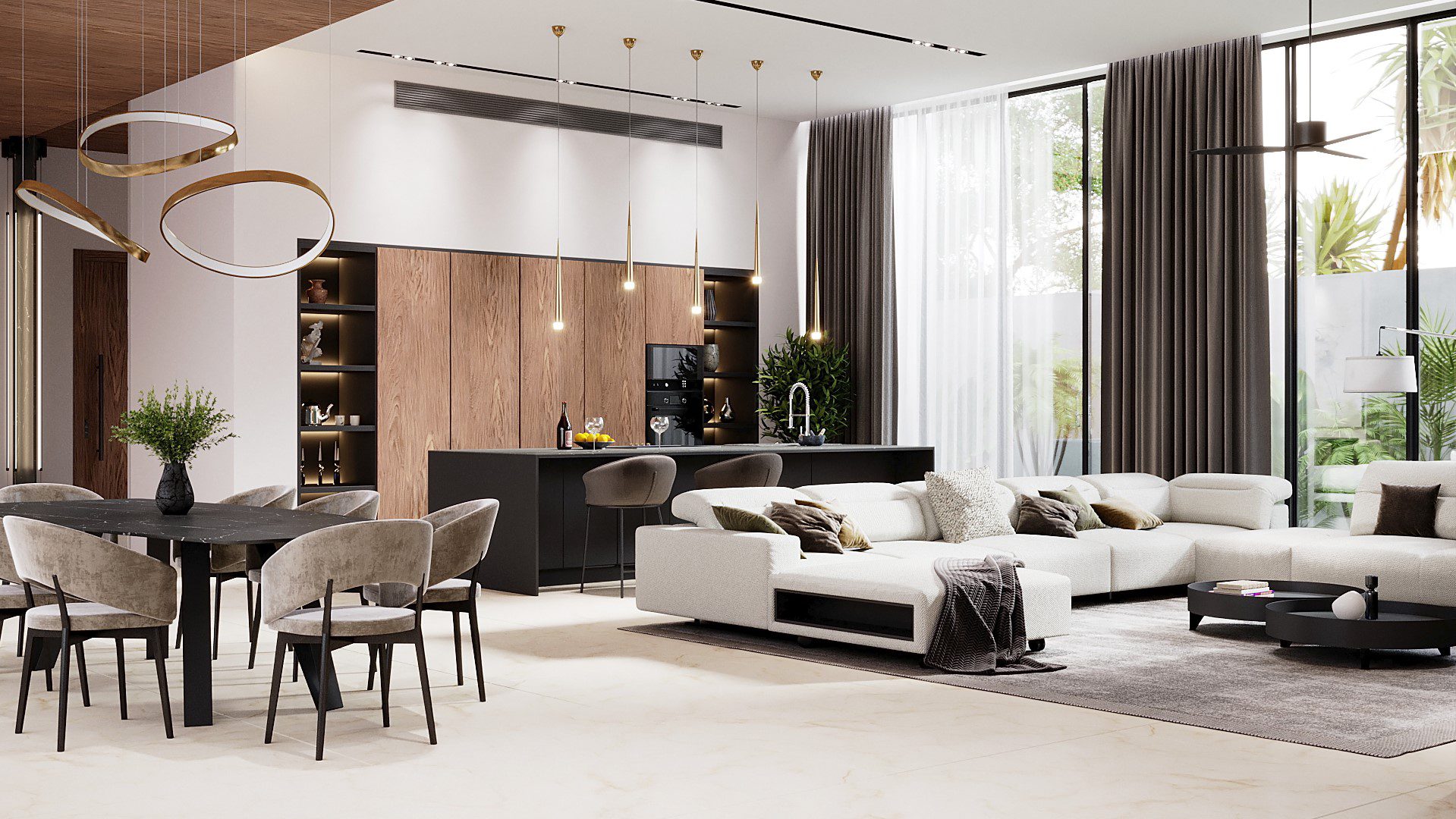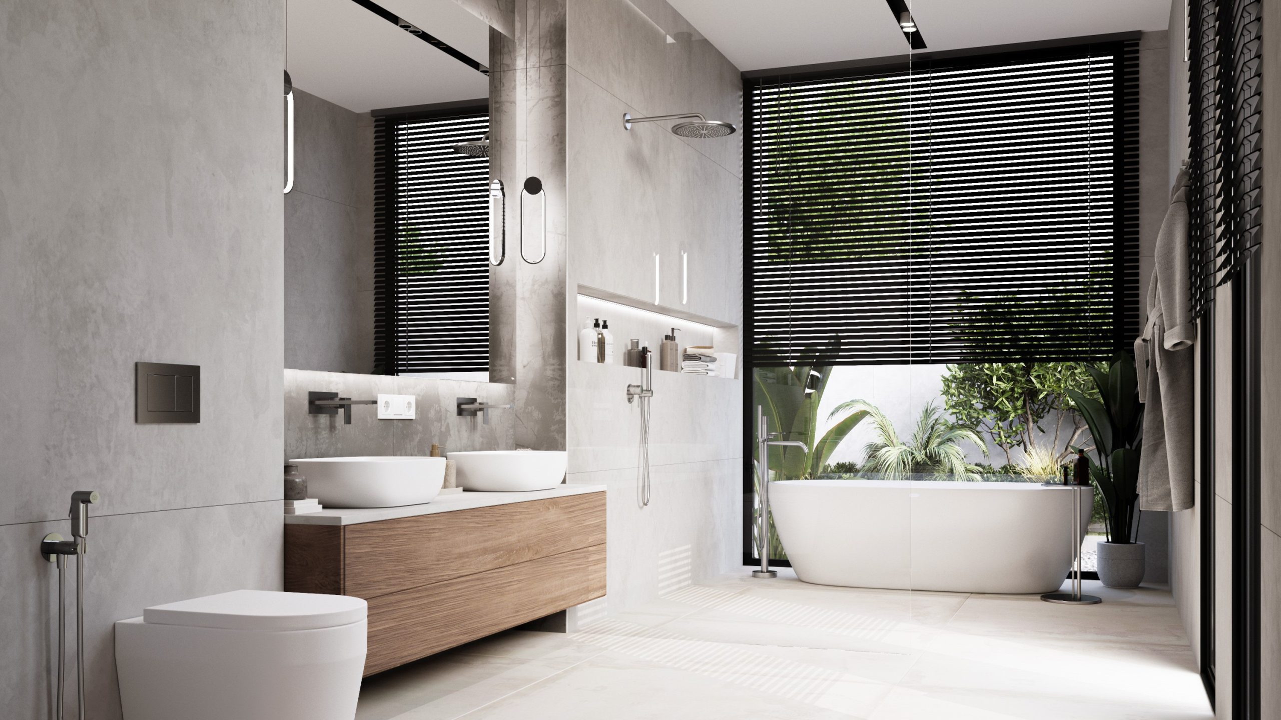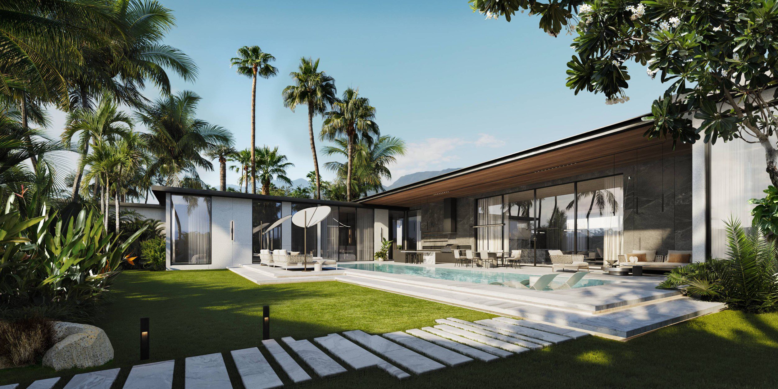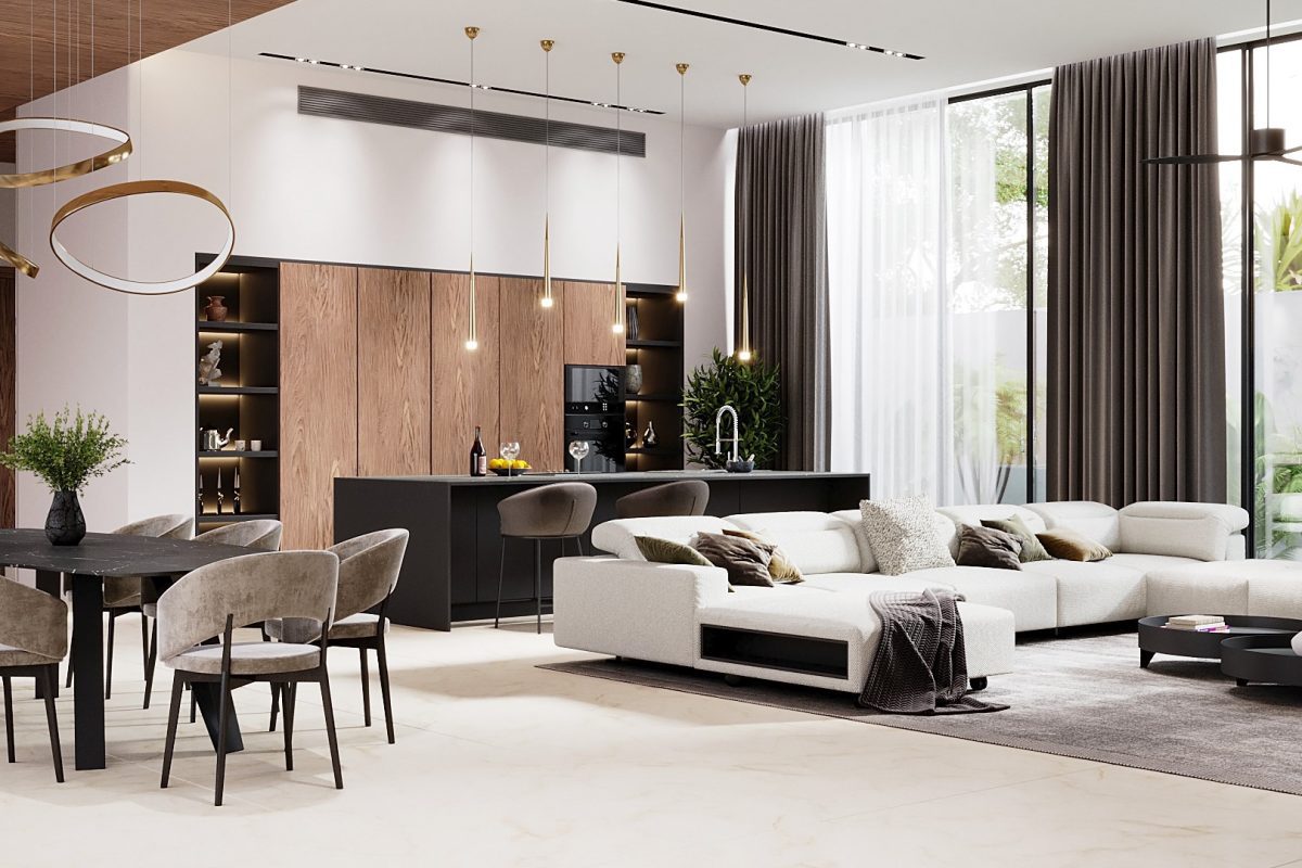 На вилле: премиальное оснащение и современные технологии. Каждая оснащена частным бассейном (5 × 14 м) с джакузи и автоматизированной системой фильтрации, панорамными окнами с низкоэмиссионным покрытием (стеклопакеты TOSTEM) для теплоизоляции и защиты от ультрафиолета, а также системой «умный дом» для управления освещением, вентиляцией и климатом. Кухня укомплектована встроенной техникой и мебелью бренда Miton (Италия). Гостиная и столовая зоны обставлены мебелью фабрик Guzzini и Fontana. Главная спальня включает гардеробную и ванную комнату с ванной и душем; в отделке использованы дерево и камень. На территории — терраса с солярием, душ на открытом воздухе, подсобное помещение и крытая парковка на 2 машины с воротами Hormann. Дополнительно виллы оснащены солнечными панелями, системой фильтрации и охлаждения воды, а толстые стены (от 24 см) и теплоизоляция кровли обеспечивают комфортный микроклимат внутри.