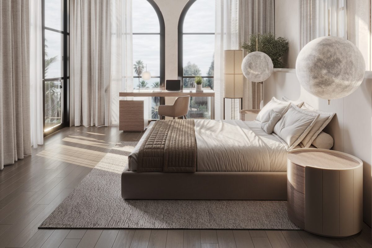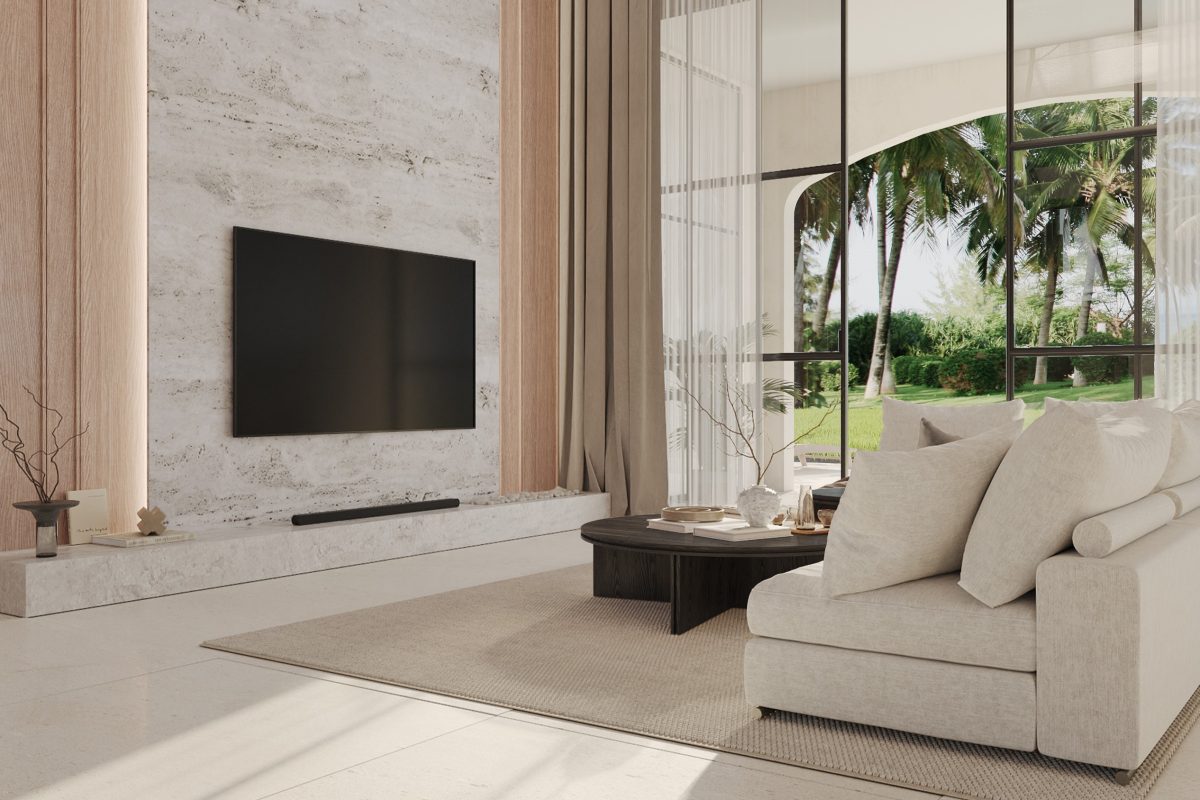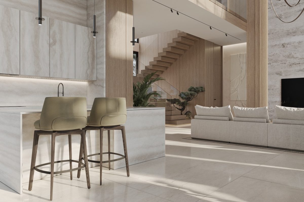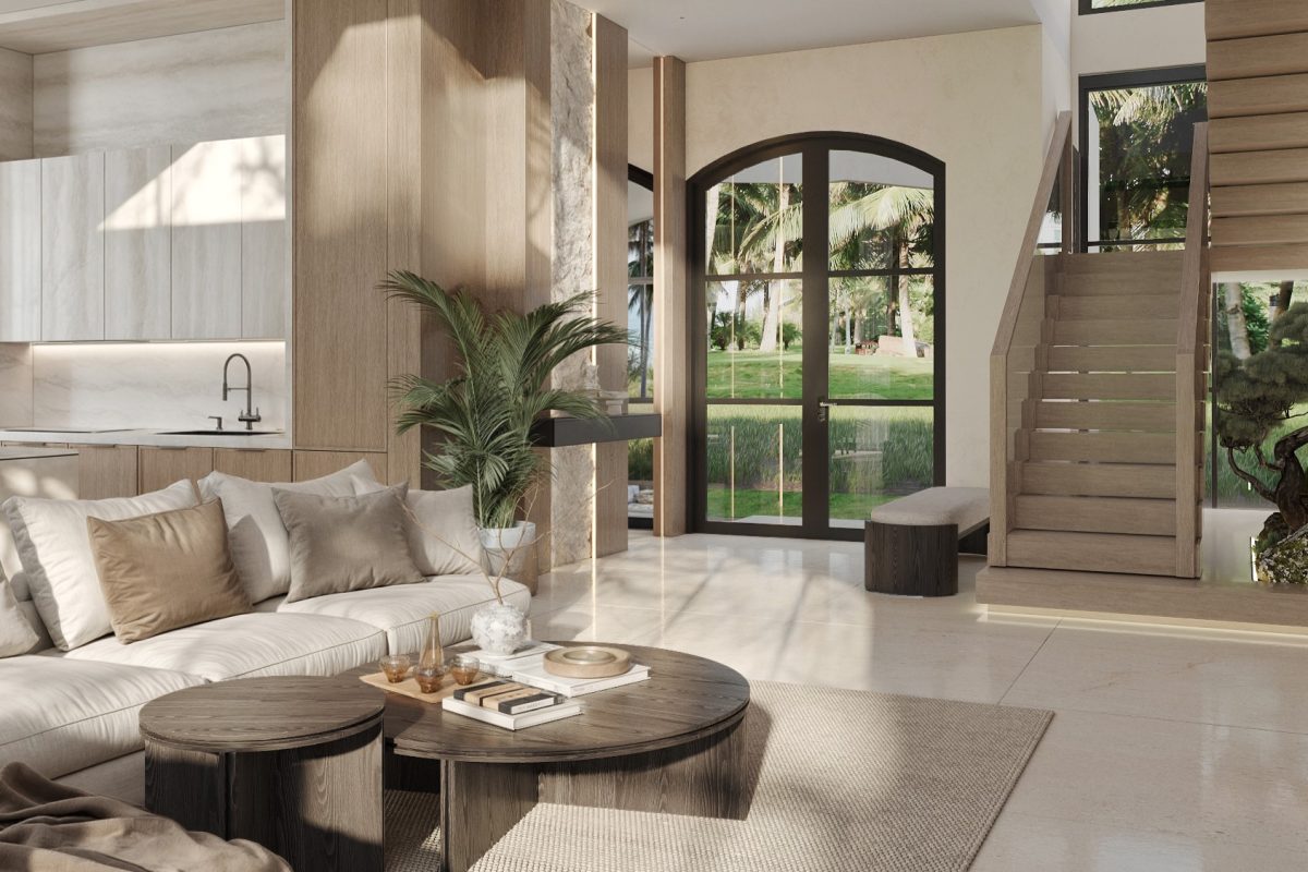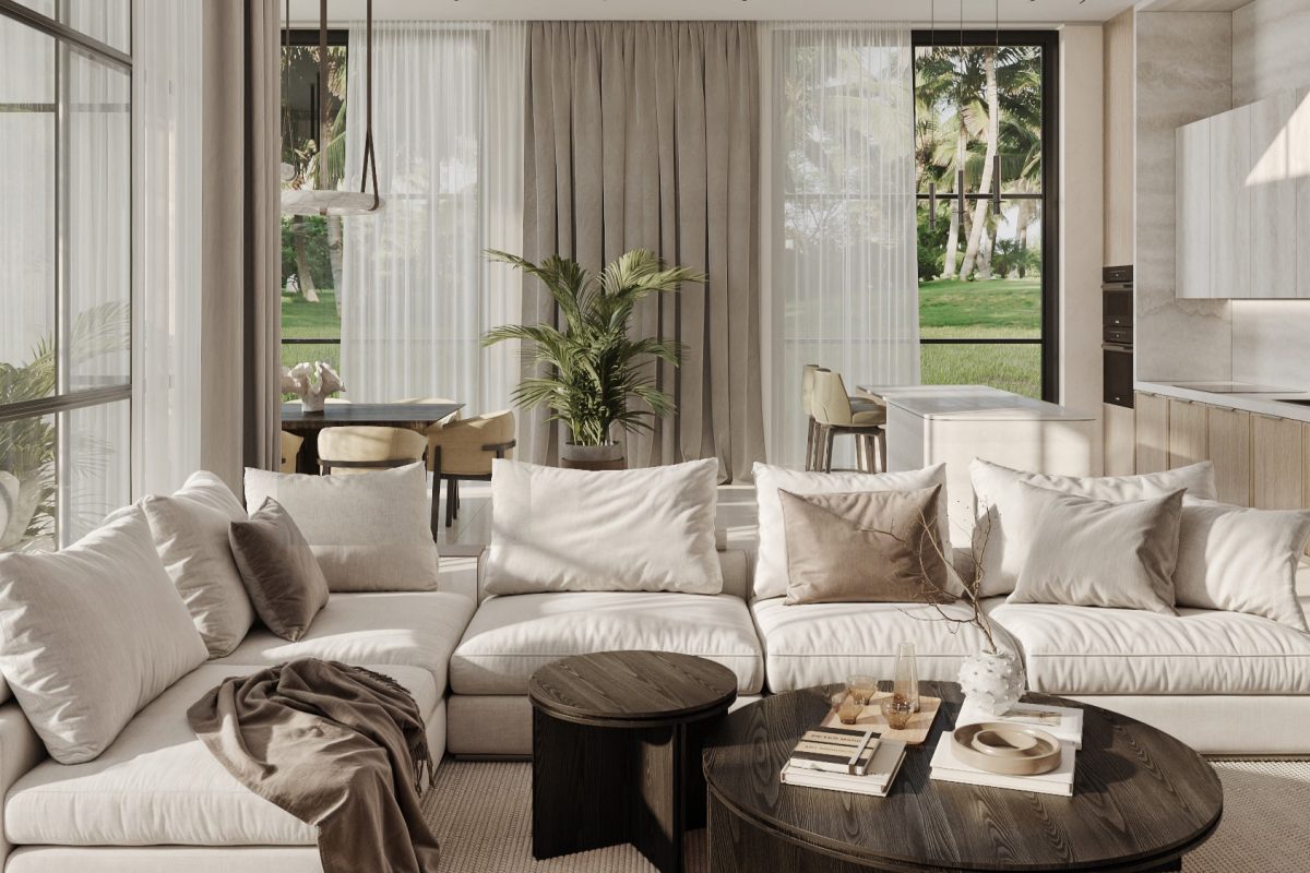 На вилле: дома выполнены в минималистичном стиле с натуральными материалами. Высокие потолки, большие окна и нейтральные тона создают простор и уют. Кухни оформлены мрамором, спальни имеют вместительные гардеробные, а ванные — современную сантехнику. Ландшафт включает бассейны, террасы и зеленые зоны. Доступны одно- и двухэтажные дома с 2–4 спальнями.