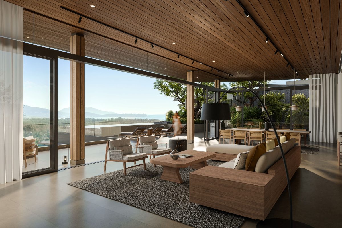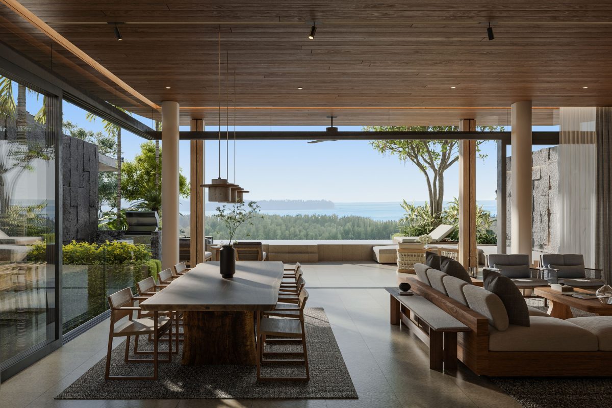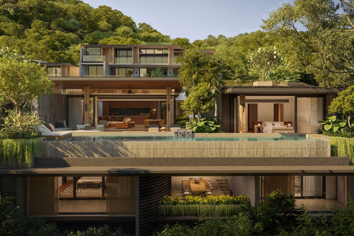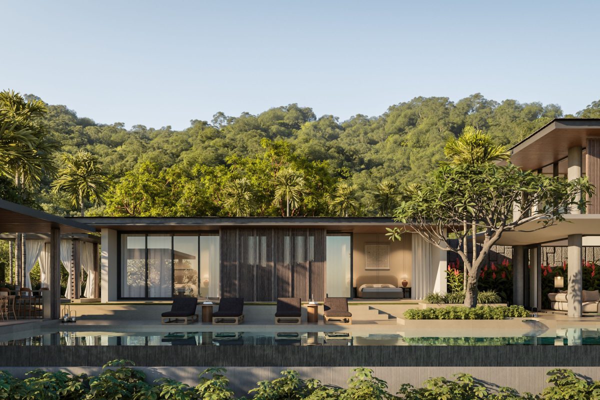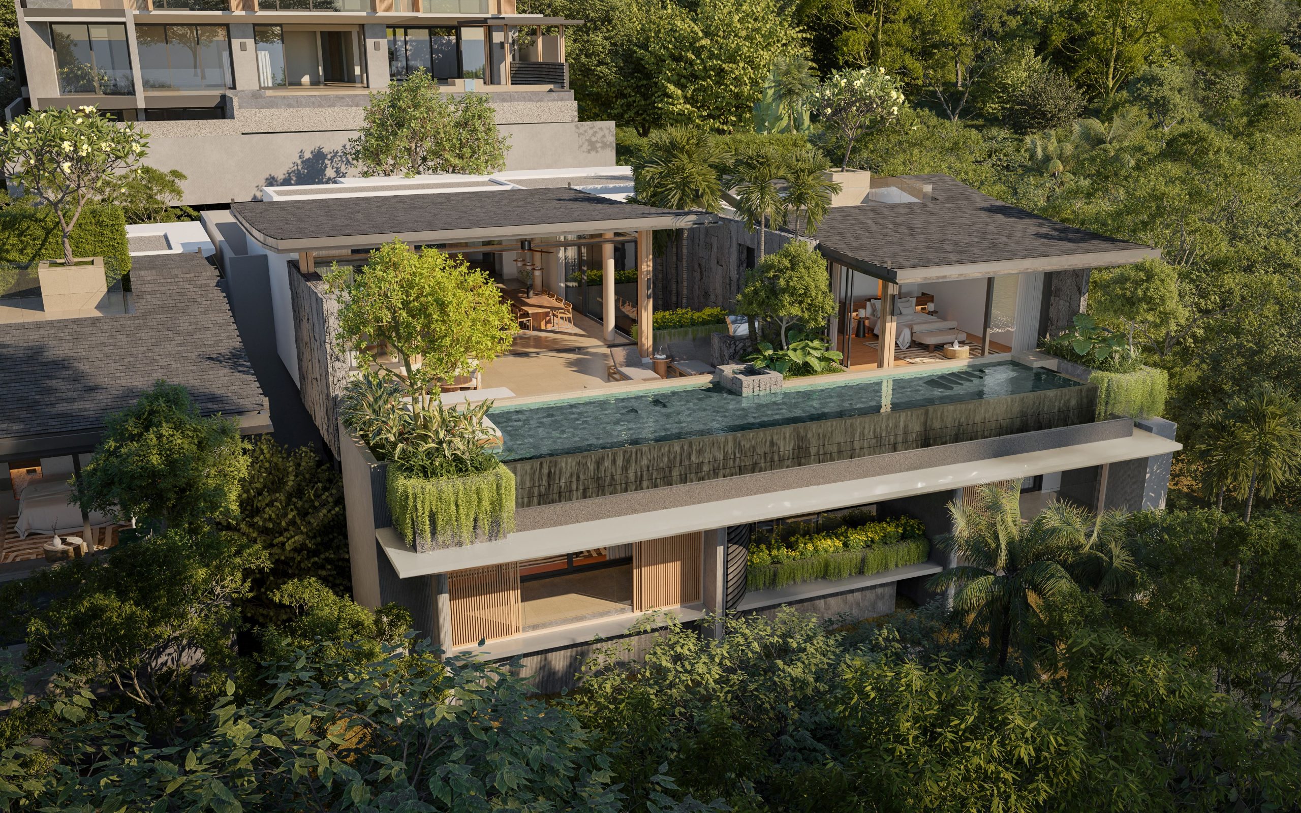 На вилле: просторные виллы с 4–5 спальнями расположены на участках площадью от 600 до 2000+ м². Продуманные планировки включают просторную гостиную с кухней и обеденной зоной, мастер-сьют с собственной террасой, внутренние дворики с зеленью, рабочие кабинеты, гардеробные, зоны отдыха, панорамные балконы, а также приватный инфинити-бассейн. Предусмотрены технические помещения, прачечная, кладовые, отдельные зоны для персонала и удобная парковка. Архитектура выполнена международной студией, сочетает минимализм, природные материалы и открытую планировку с интеграцией природы.