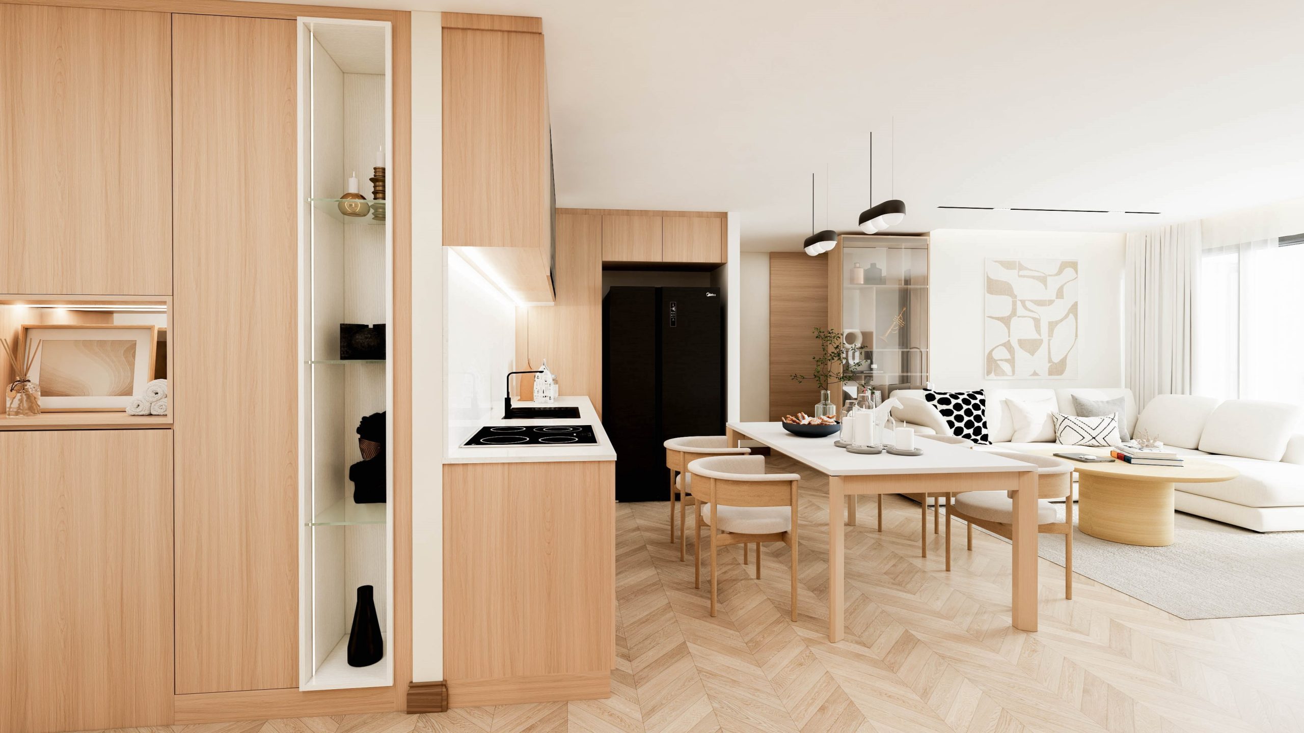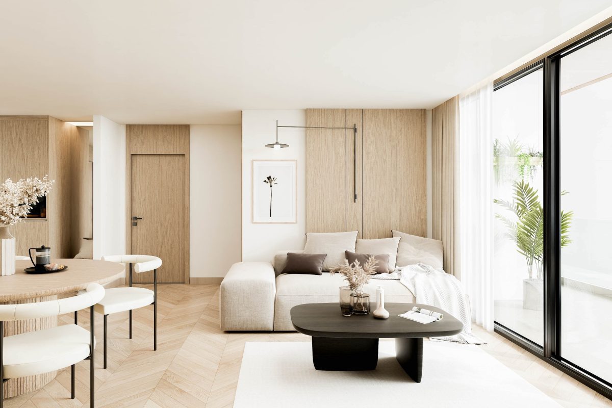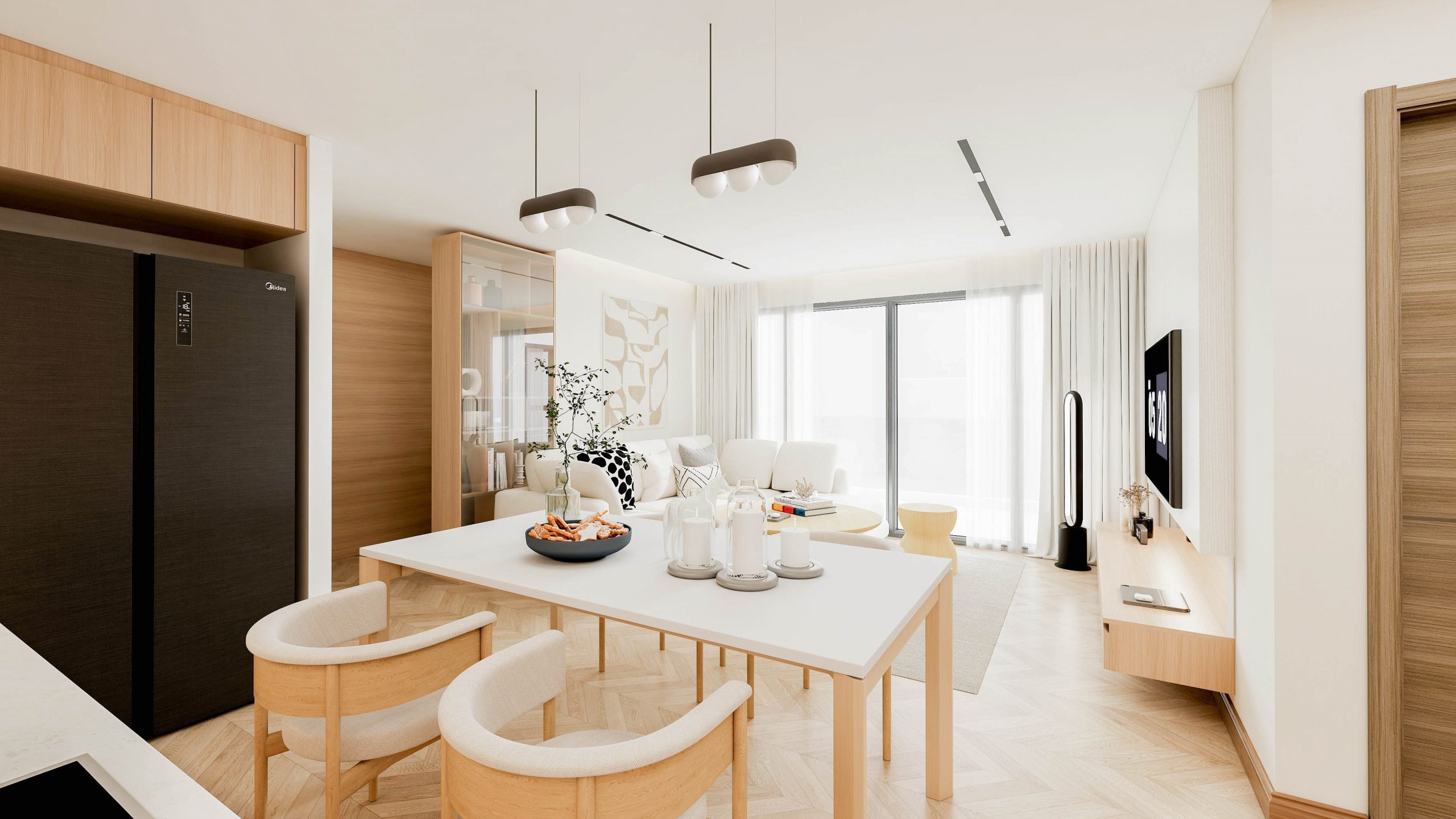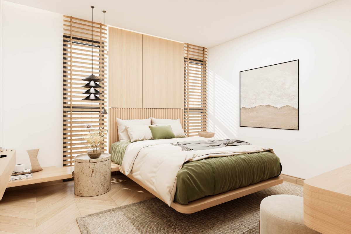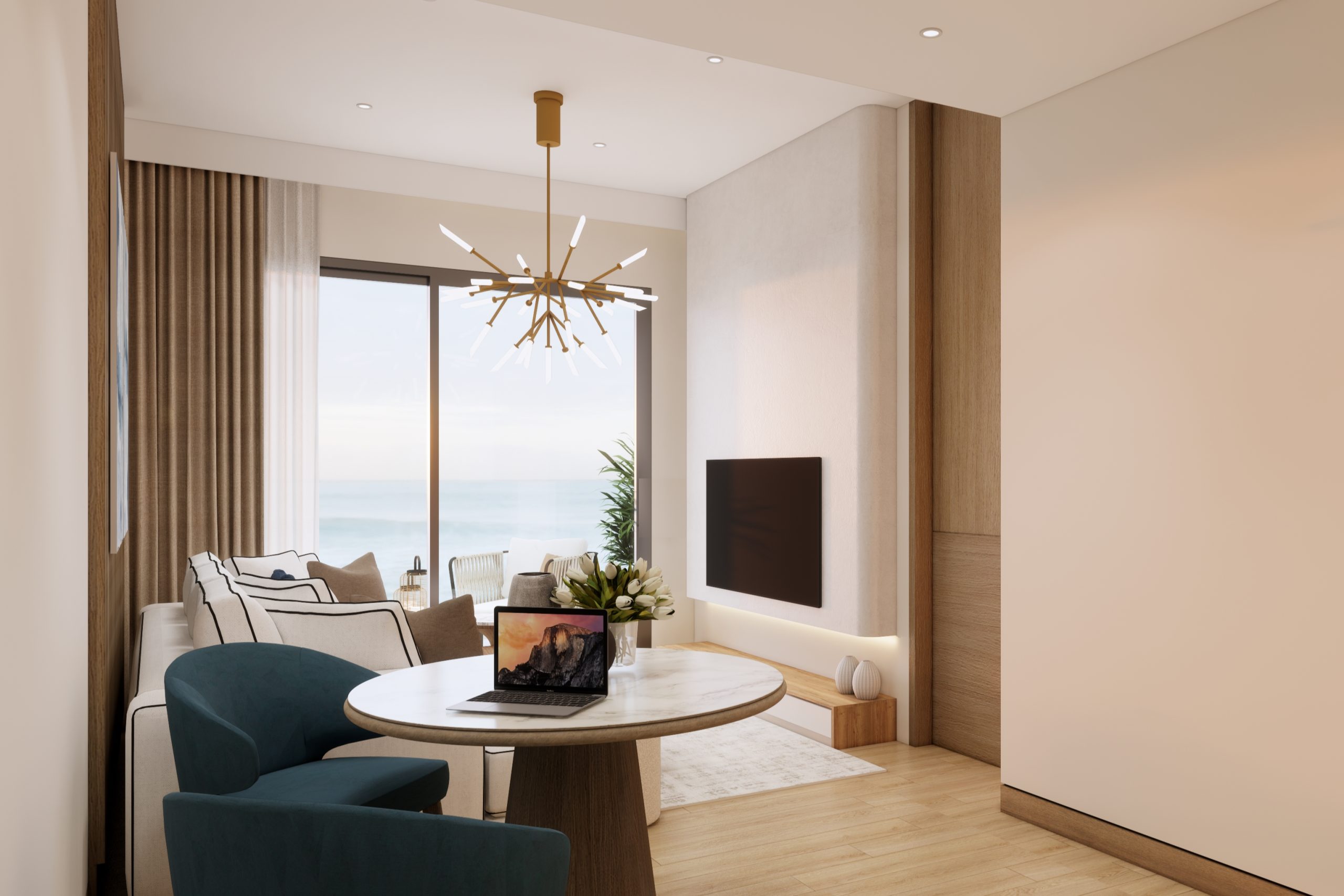 В апартаментах: в комплексе представлены резиденции с 1, 2 и 3 спальнями, продуманные для комфортного проживания и отдыха. Просторные террасы, собственный сад и бассейн (для некоторых типов) создают атмосферу приватности и уюта. В оформлении использованы естественные материалы и нейтральная палитра, подчеркивающие гармонию с морем и природой.