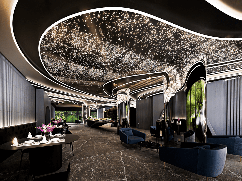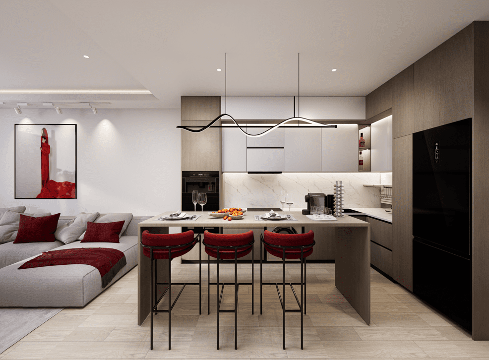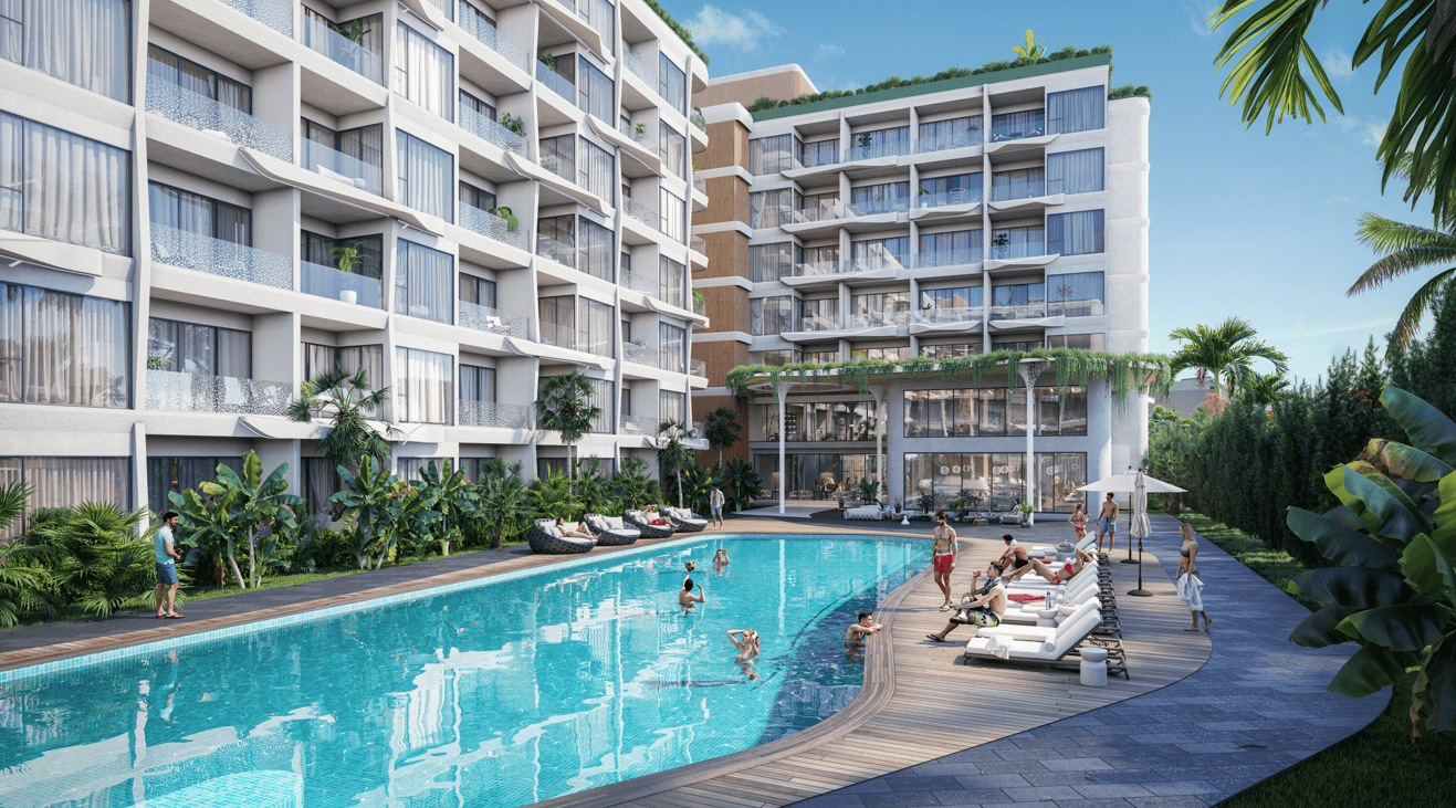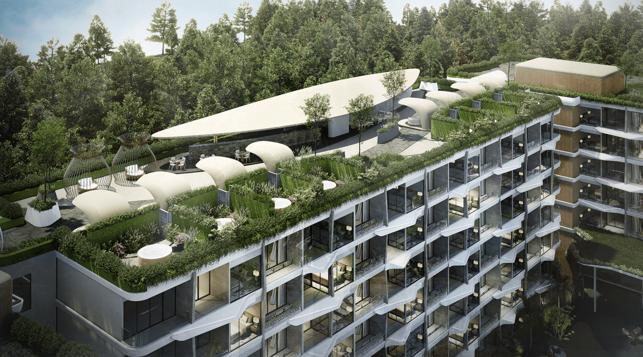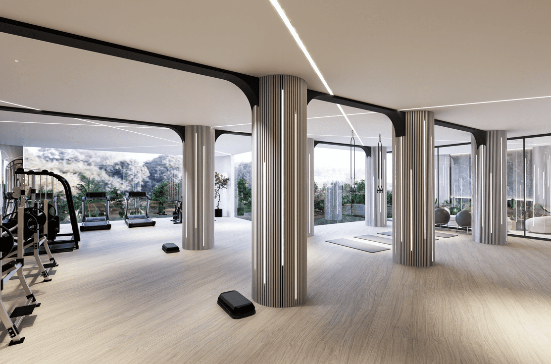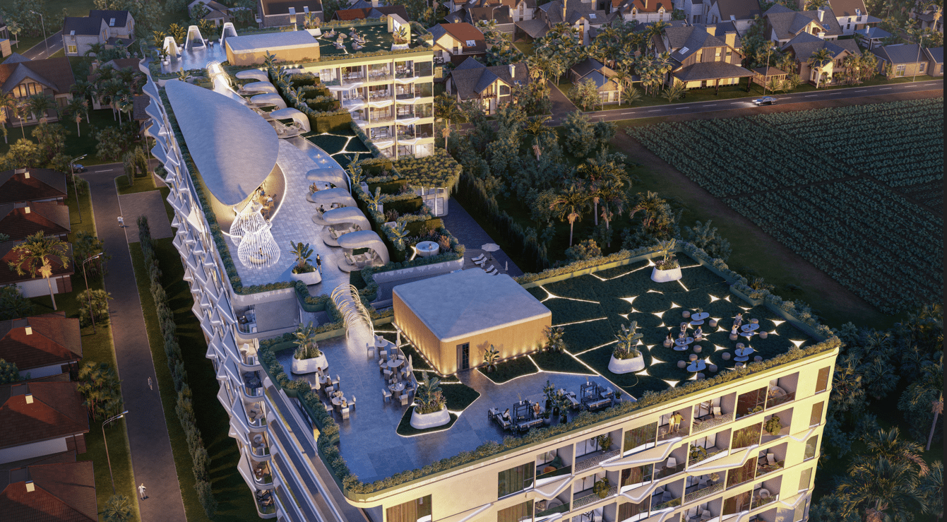 В комплексе: 3 жилых здания, 7 этажей, 285 квартир. Бассейн, коворкинг, 2 ресторана, детская комната, тренажерный зал, охрана и видеонаблюдение 24/7.