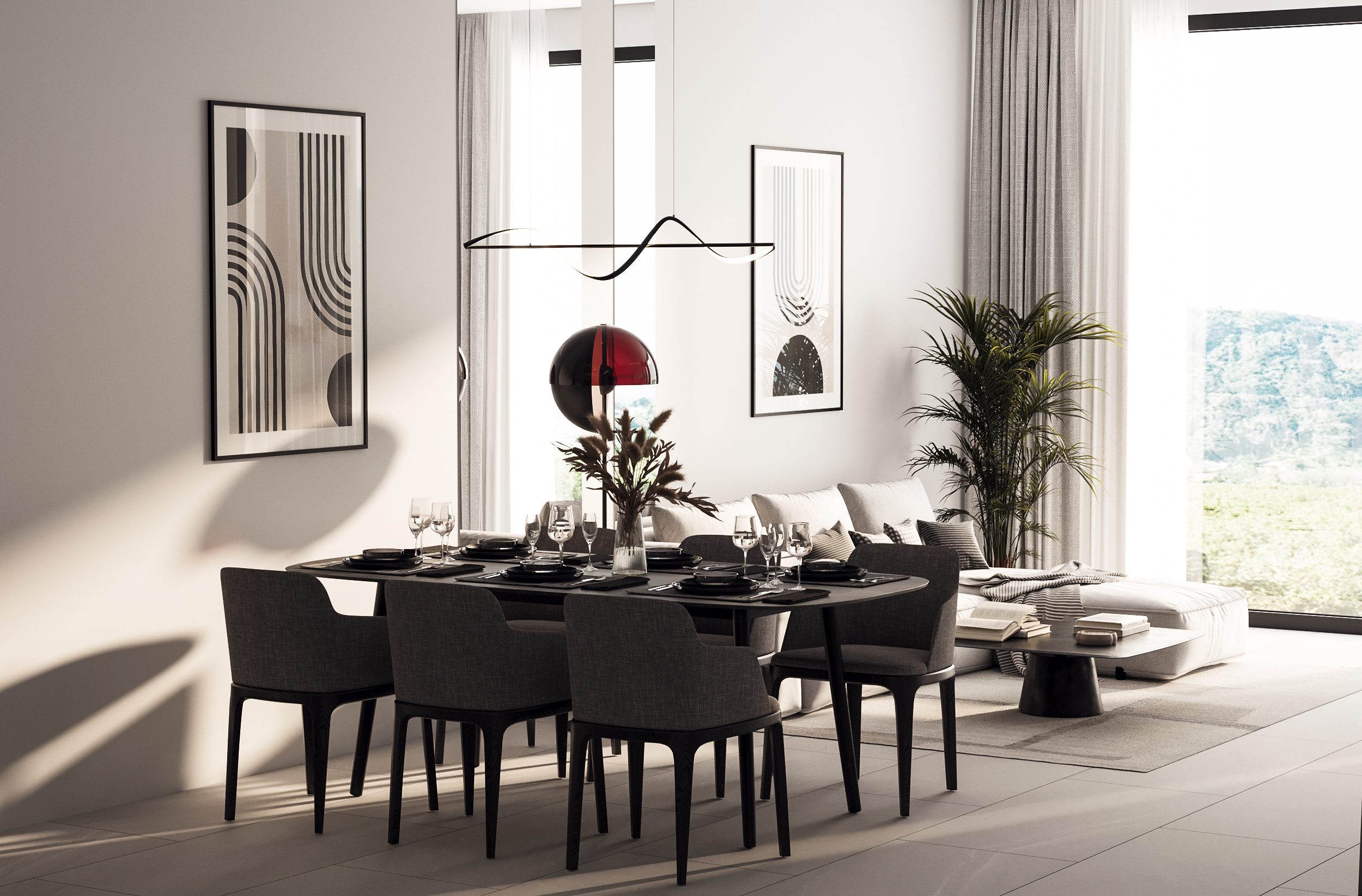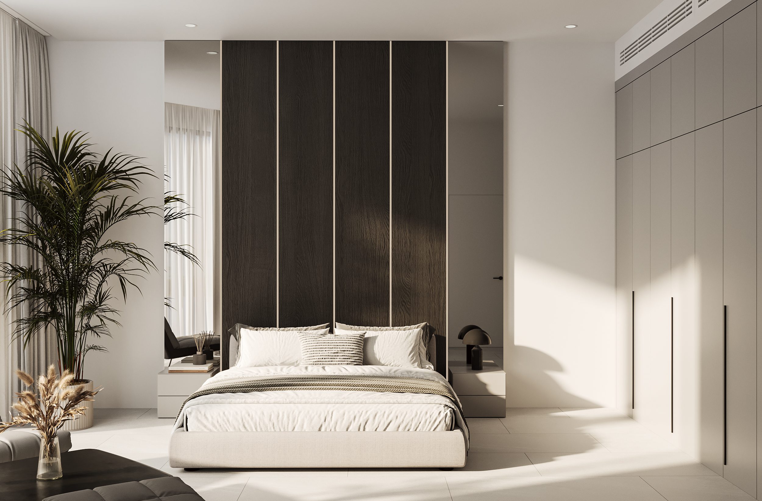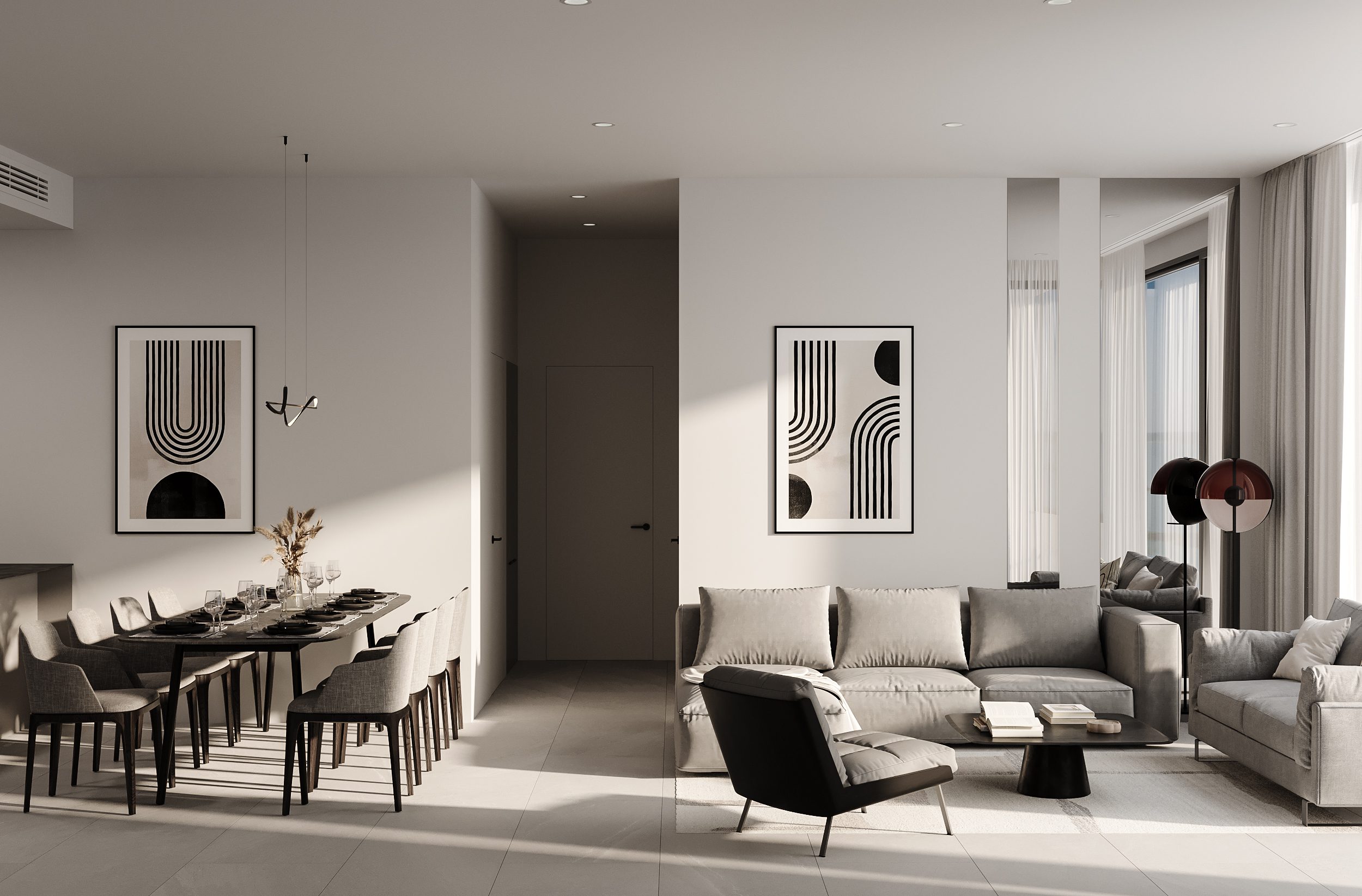 В апартаментах: в комплексе представлено разнообразие планировок — от студий до просторных пентхаусов, включая нестандартные угловые варианты. Интерьеры выполнены в нейтральных тонах в стиле минимализм, с использованием качественных материалов. Апартаменты оснащены встроенной мебелью, кухонной зоной с техникой и местом для обеденной группы.