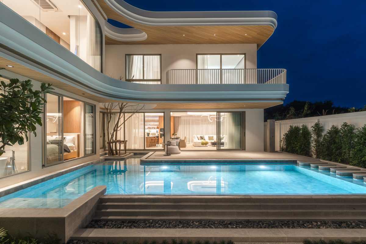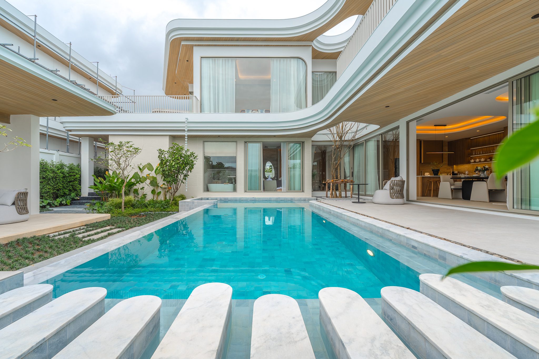 На вилле: каждая вилла выполнена в современном архитектурном стиле с использованием натуральных материалов и продуманной планировкой, обеспечивающей максимум пространства и света. Просторные гостиные с панорамным остеклением объединены с обеденными зонами и выходят на террасы с частным бассейном. Виллы оснащены современной встроенной кухней с техникой Bosch, а санузлы оборудованы системой KÄSCH Wellness. Во всех резиденциях предусмотрено от 4 до 5 ванных комнат, а также дополнительные помещения, которые можно адаптировать под гардеробную, кабинет или зону отдыха.